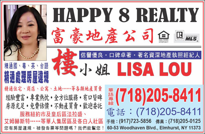 HAPPY & REALTY-LOU, LISA-富豪地產公司-樓小姐 Tel: 718-205-8411